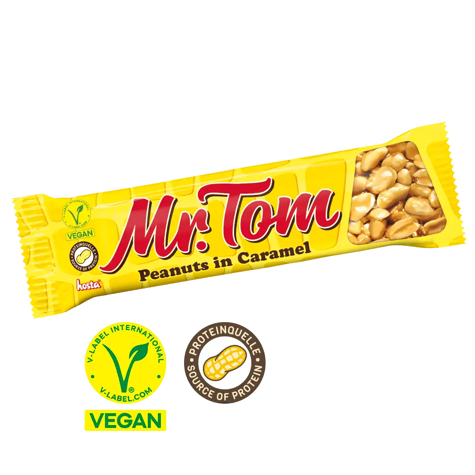 Mr.Tom, der Klassiker von HOSTA! Seit 1955 – bis 1993 noch als „Onkel Tom“ – begeistert er taffe Ladies und echte Kerle. Seine inneren Werte sind zeitlos. Mit dem einzigartigen Charakter von karamellisierten und gerösteten Erdnüssen bleibt Mr.Tom ein unverwechselbarer Trendsetter über Generationen!